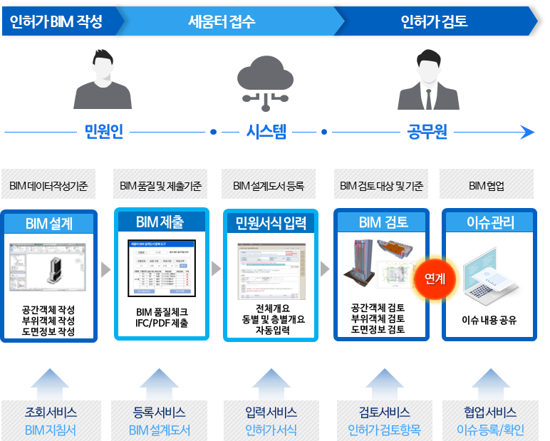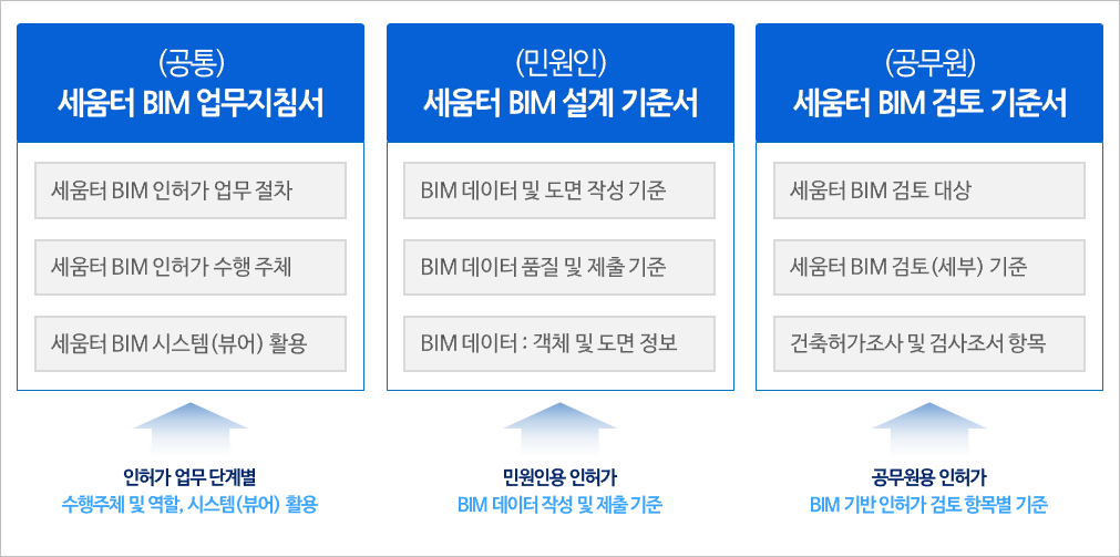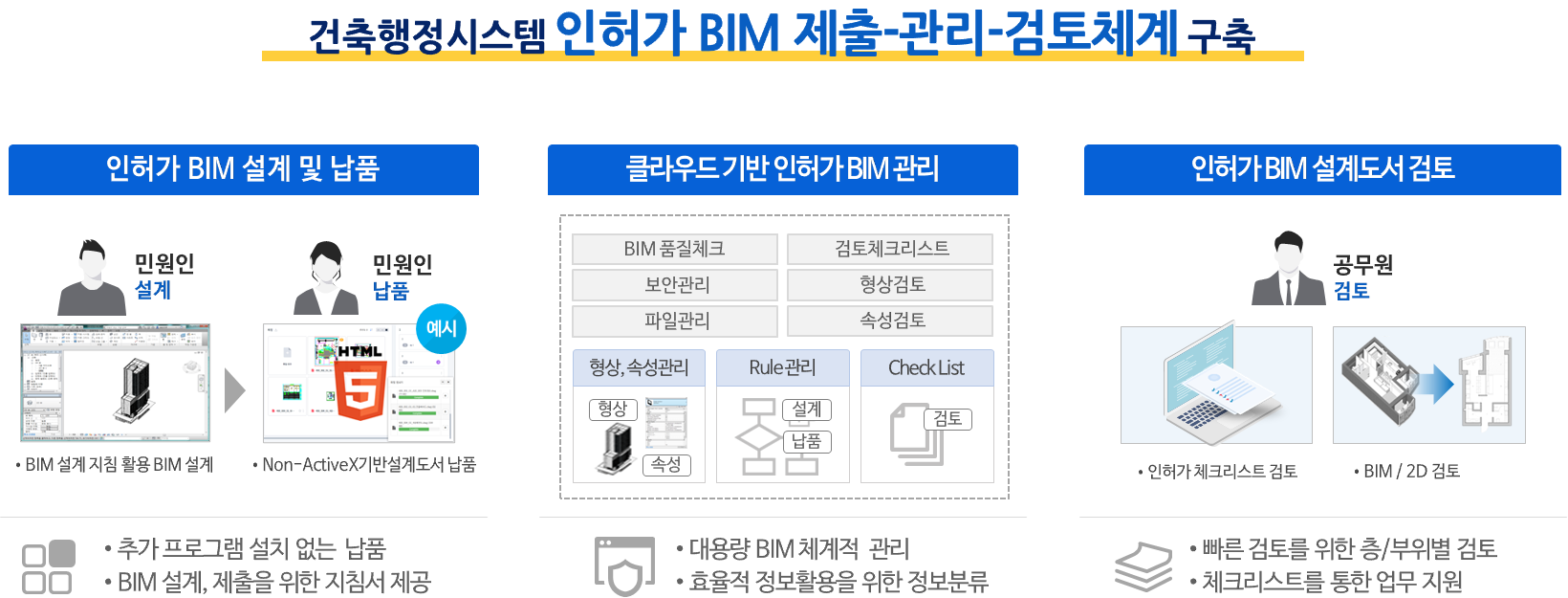 - 클라우드 건축행정시스템에 BIM 설계도서를 제출하고 검토/관리 할 수 있도록 지원하는 서비스을 위한 '설계기준서', '업무지침서', '검토기준서' 작성지원.