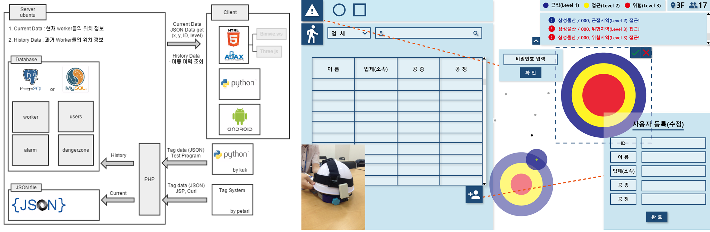 - 작업자의 안전관리를 위하여 위치를 실시간으로 추적하고, 해당 작업자의 위험 상황을 실시간으로 도식화 하여 관리하는 시스템.