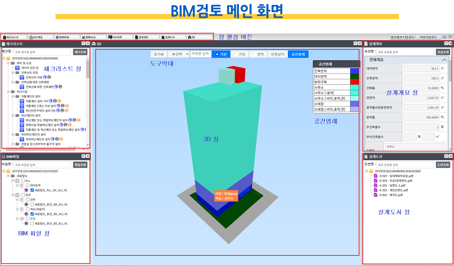- 클라우드 건축행정시스템에 BIM 설계도서를 제출하고 검토/관리 할 수 있도록 지원하는 서비스을 위한 '설계기준서', '업무지침서', '검토기준서' 작성지원.